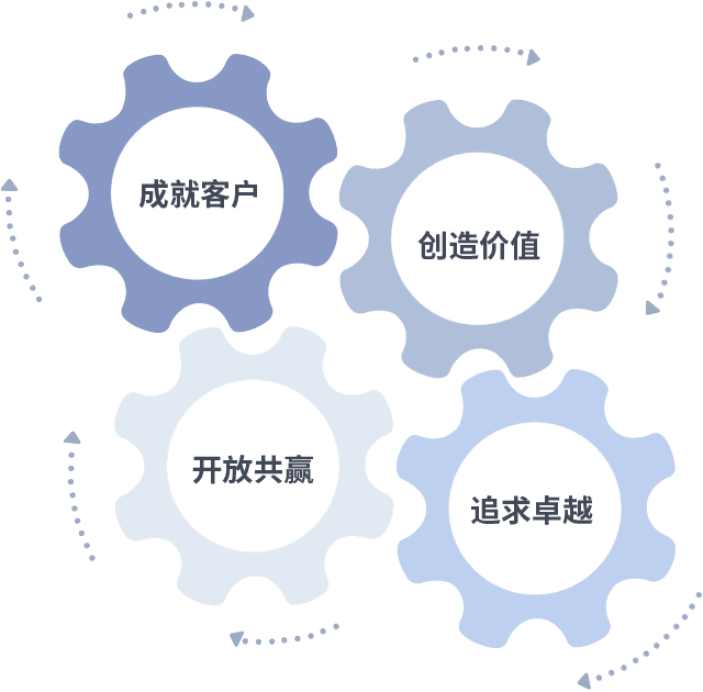 成就客户是一切决策的出发点,,,,创造价值是衡量所有工作的标准,,追求卓越是我们做事做人的态度,,,,开放共赢是我们的格局也是最终的结果。。。价值观的齿轮环环相扣,,,,推动着组织里的每个人不断向前。。