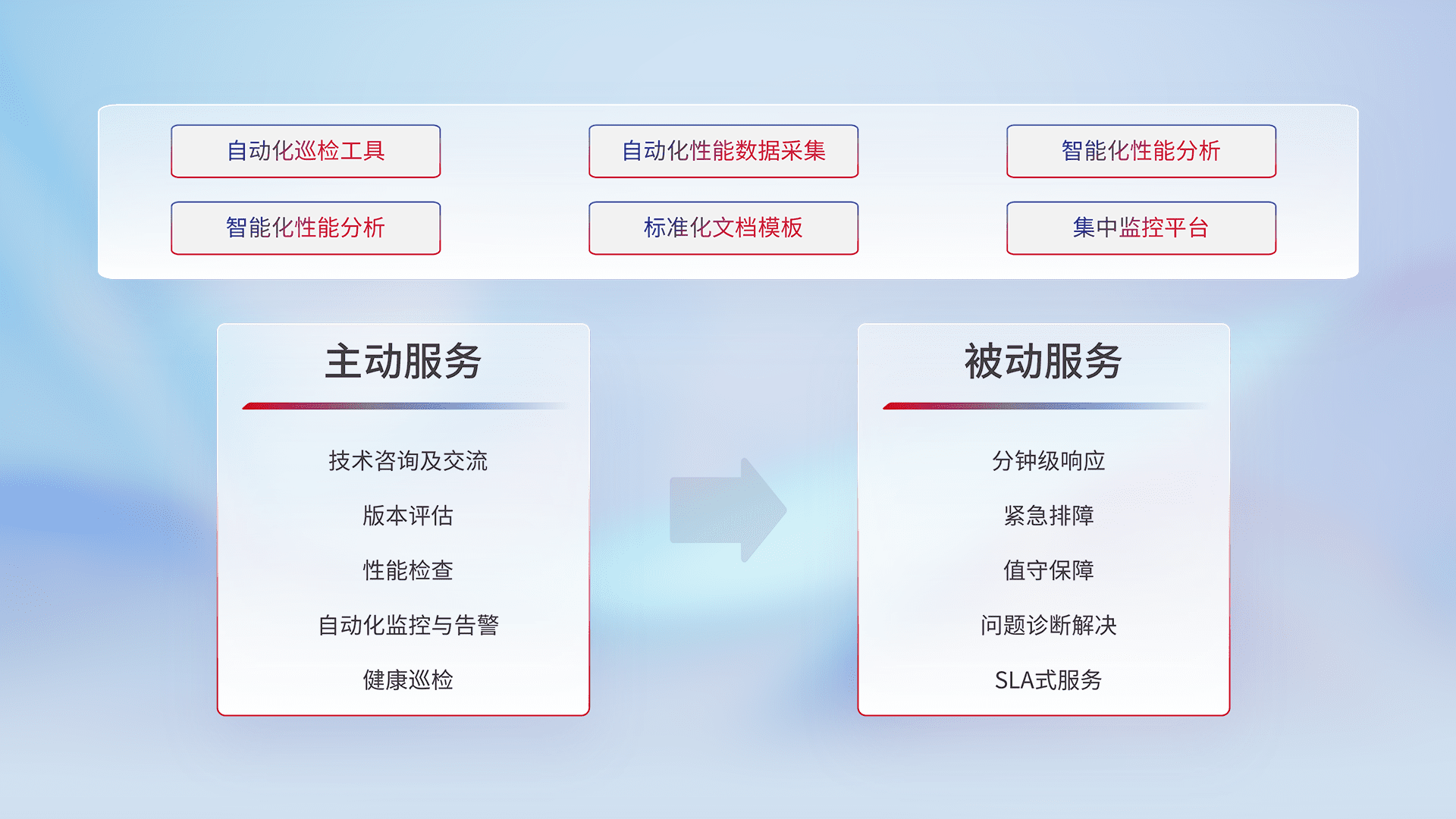 智能化工具和标准化文档,,,保障服务质量,,,,提供主动服务(包含技术咨询、、、版本评估、、性能检查、、、、自动化监控与告警、、健康巡检)和被动服务包含(分钟级响应、、紧急排障、、、值守保障、、、、问题诊断解决、、、SLA服务)。。。